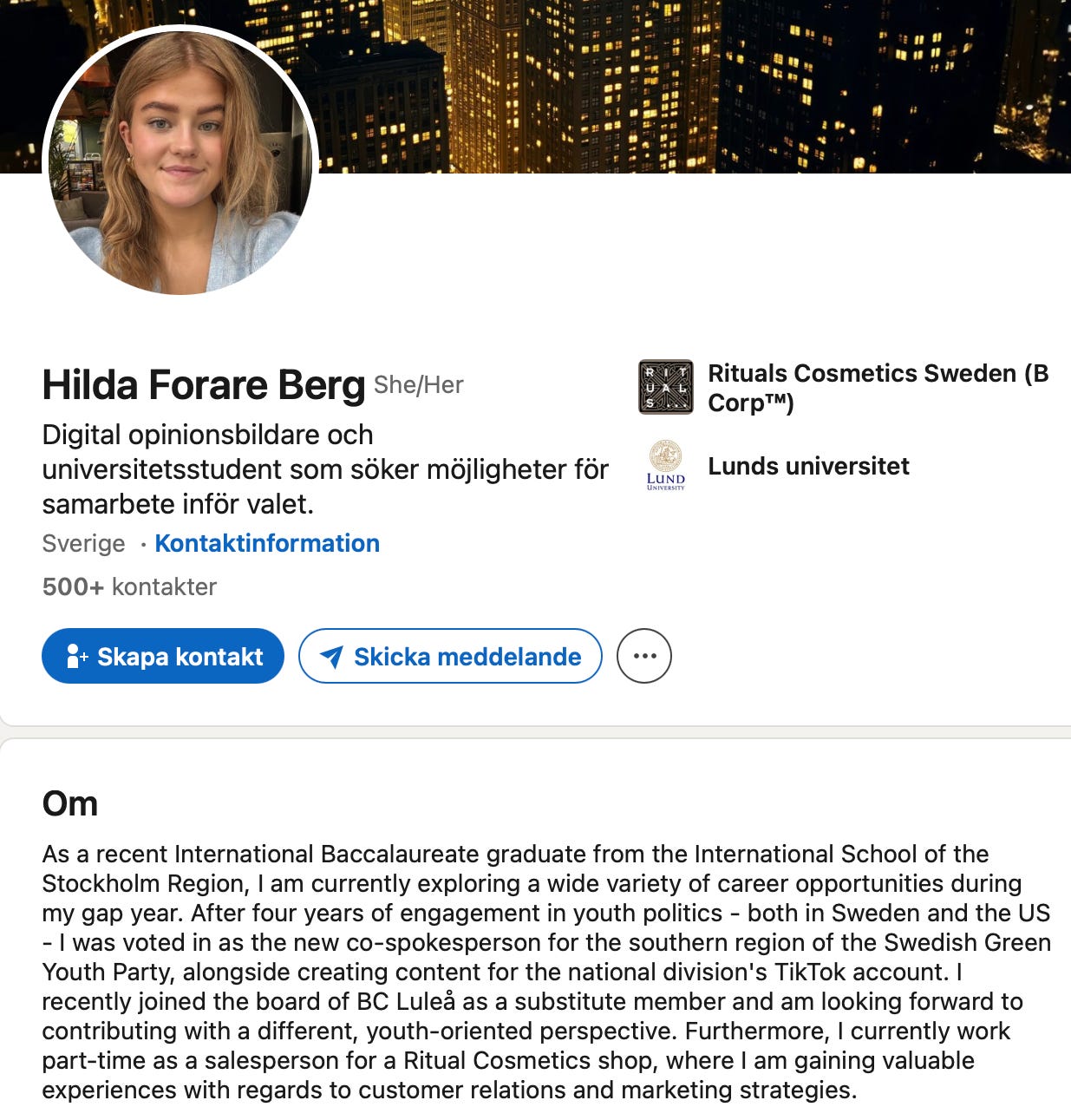 Just nu försöker Hilda Förare Berg också bygga upp sitt eget varumärke. Hon arbetade tidigare med Miljöpartiets sociala medier och har nu startat sin egen kanal, “Skitsnacket”, där varje videoklipp ser ut att få en allt mer urringad tröja.