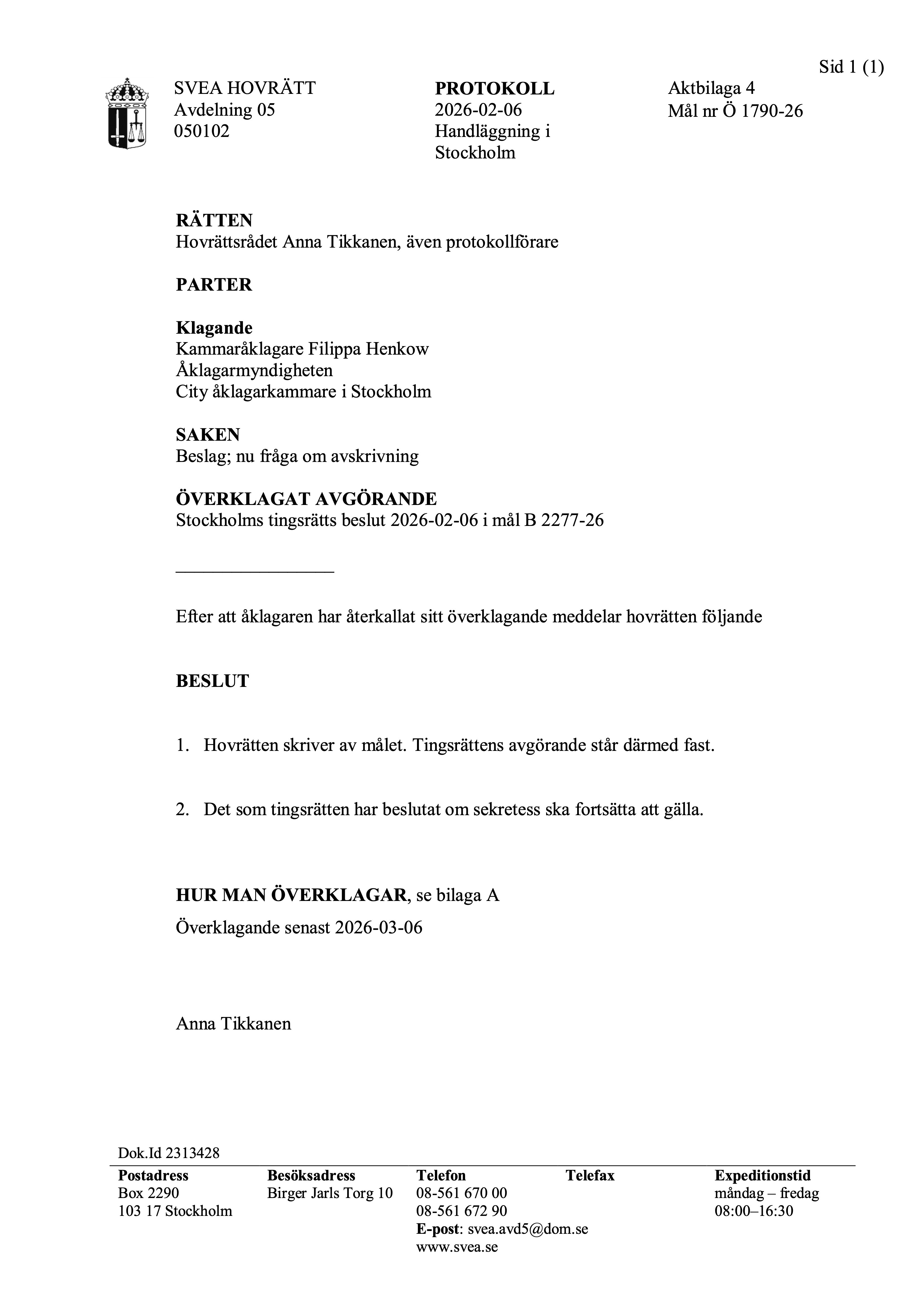 ”Efter att åklagaren har återkallat sitt överklagande meddelar hovrätten följande beslut: Hovrätten skriver av målet. Tingsrättens avgörande står därmed fast.”